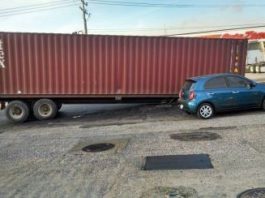 cuanto el contenedor que era jalado por un tractocamión se desprendió.