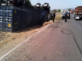 Cuantiosos daños materiales en volcadura de tráiler en libramiento El Naranjo